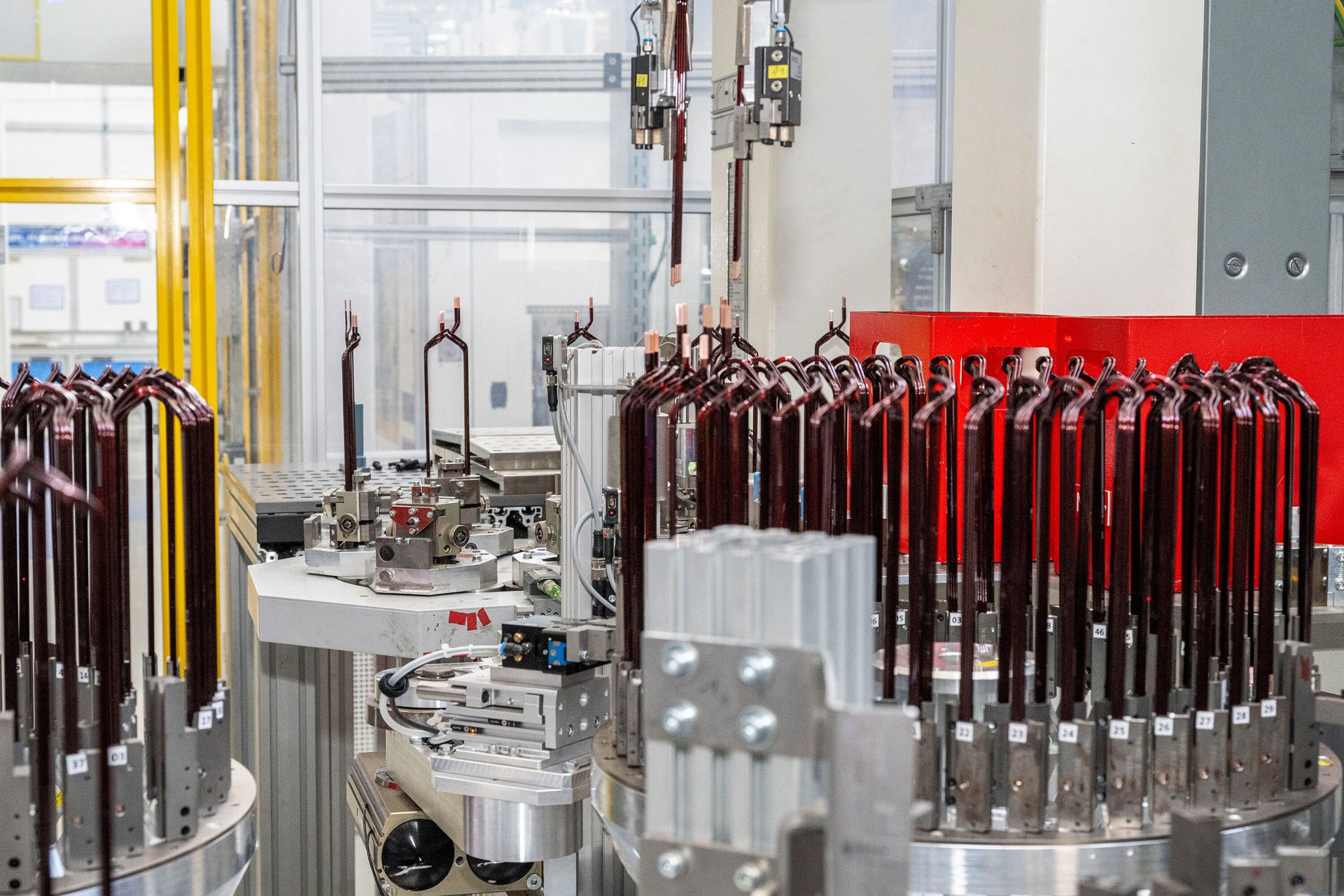 The insulated copper hairpins are inserted into the stator slots, shaped and positioned into a configuration referred to internally as a “basket.” That is joined with the stator core, followed by a series of fully automated steps, including widening, twisting and laser welding, to form all electrical connections.
